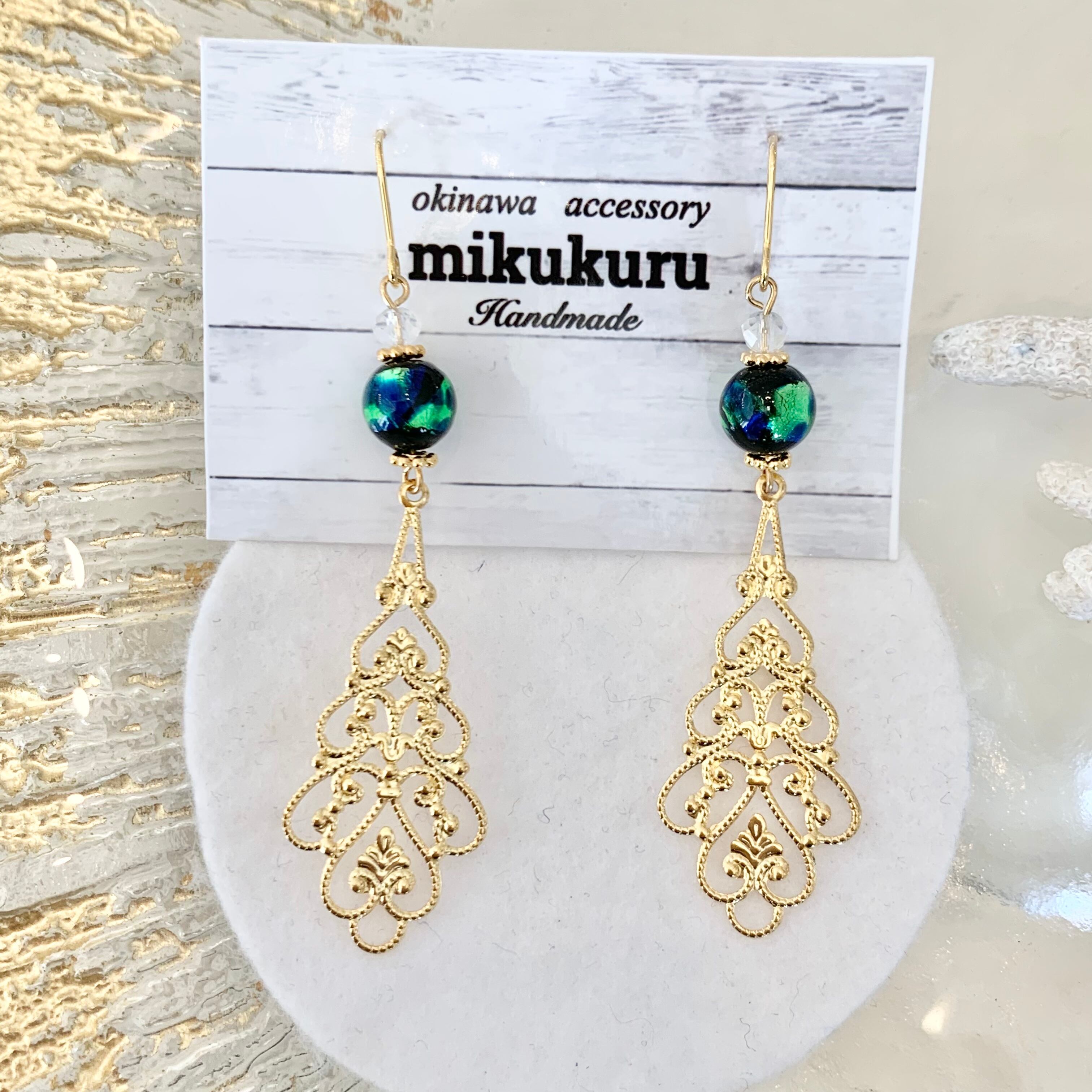 【ホタルガラス⭐︎ピアス】雫型透かしパーツ×グリーン