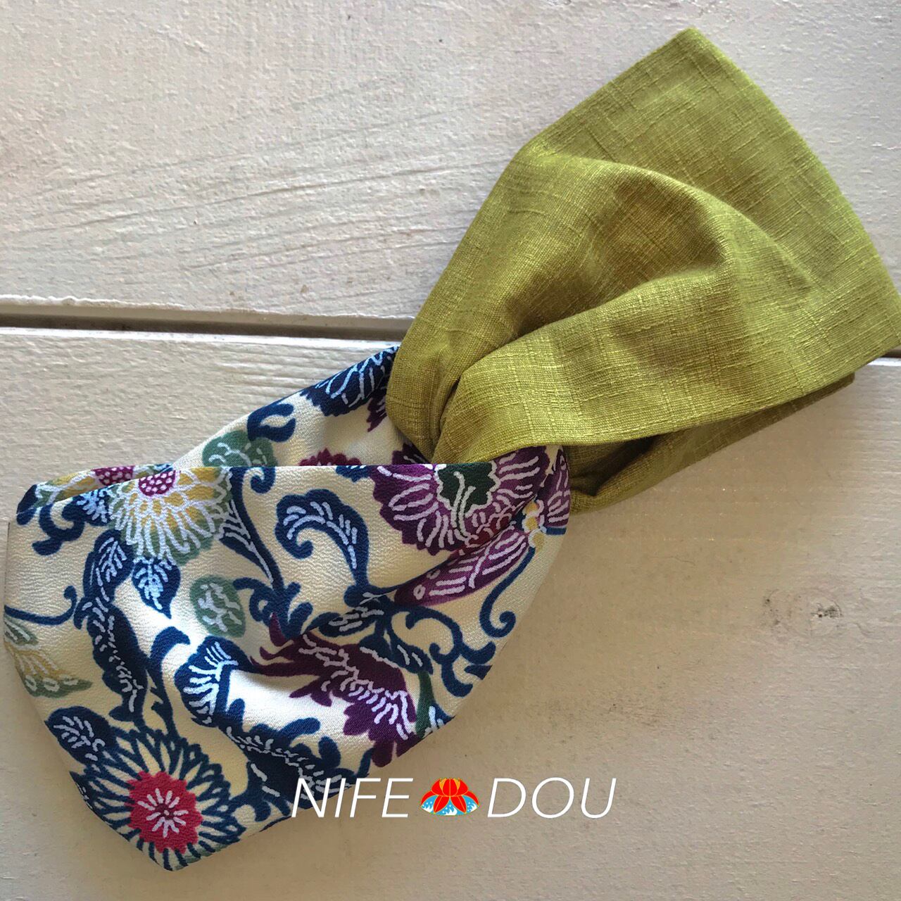 【クロスターバン】白紅型柄×黄緑/紅型柄クロスターバン/沖縄クロスターバン