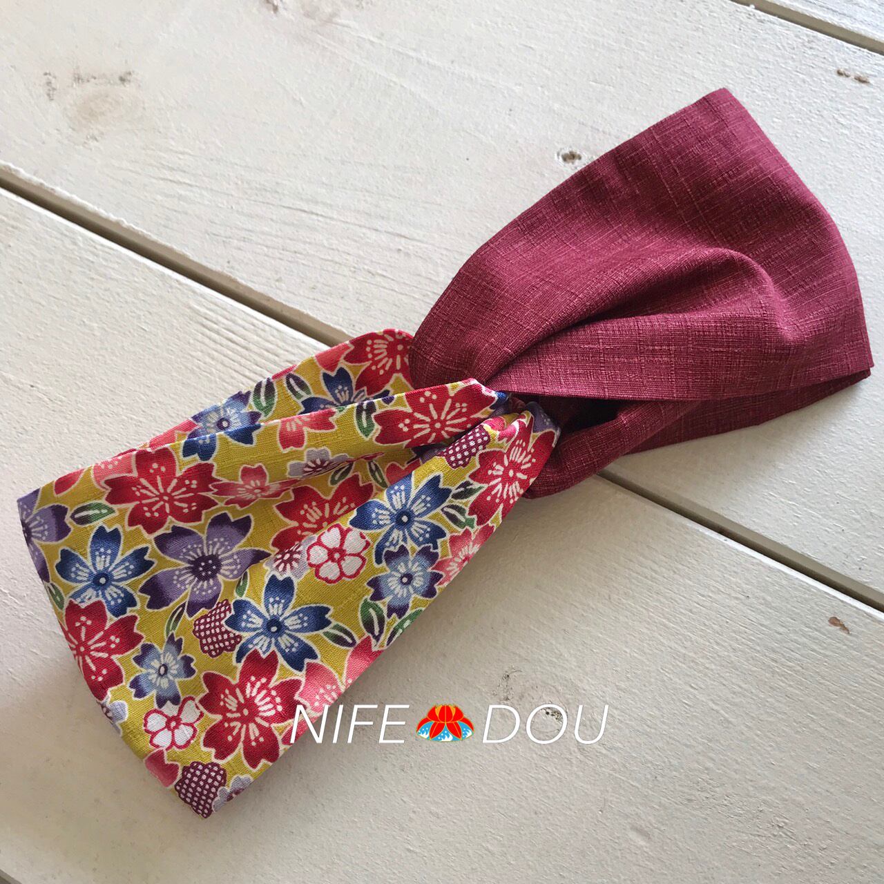 【クロスターバン】綿マスタード紅型柄×赤/沖縄クロスターバン