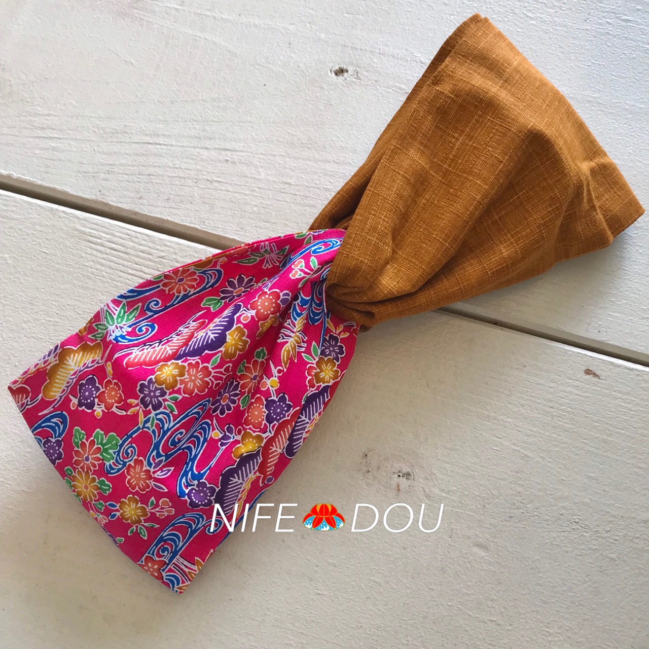 【クロスターバン】綿ピンク紅型柄×オレンジ/沖縄クロスターバン