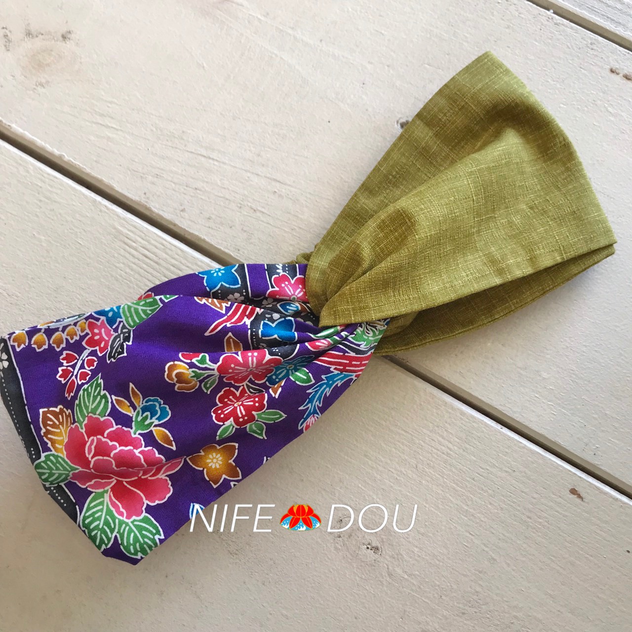 【クロスターバン】綿紫紅型柄×黄緑/沖縄クロスターバン