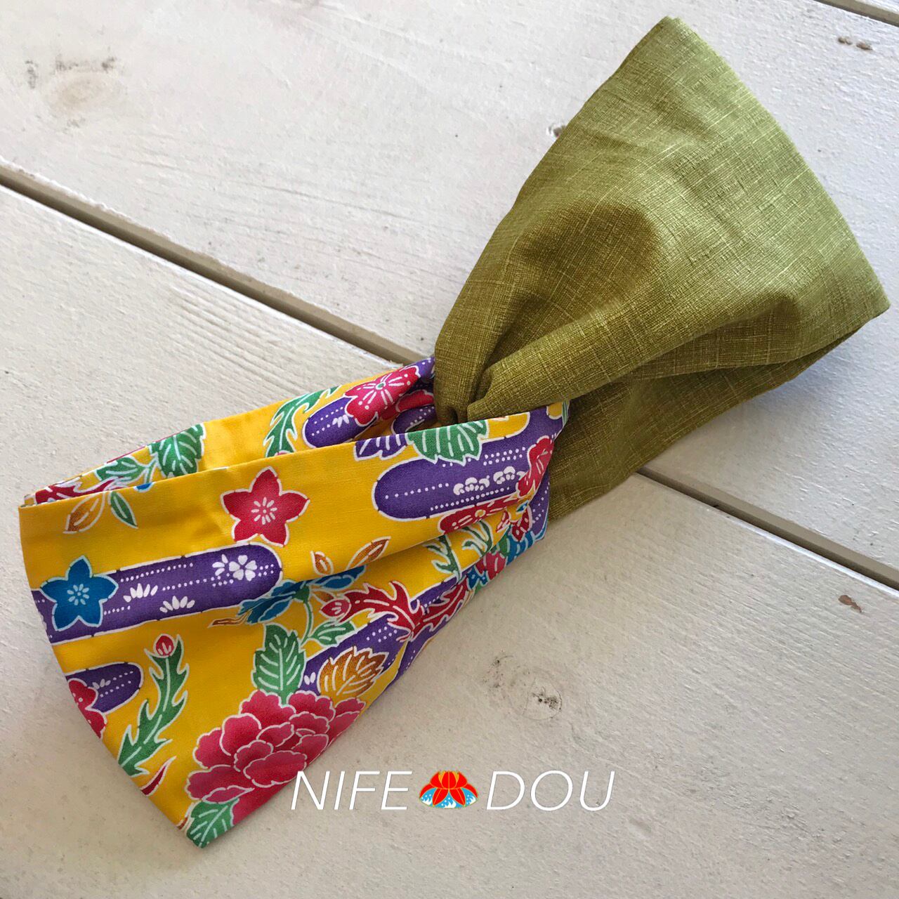 【クロスターバン】綿黄色紅型柄×黄緑/沖縄クロスターバン