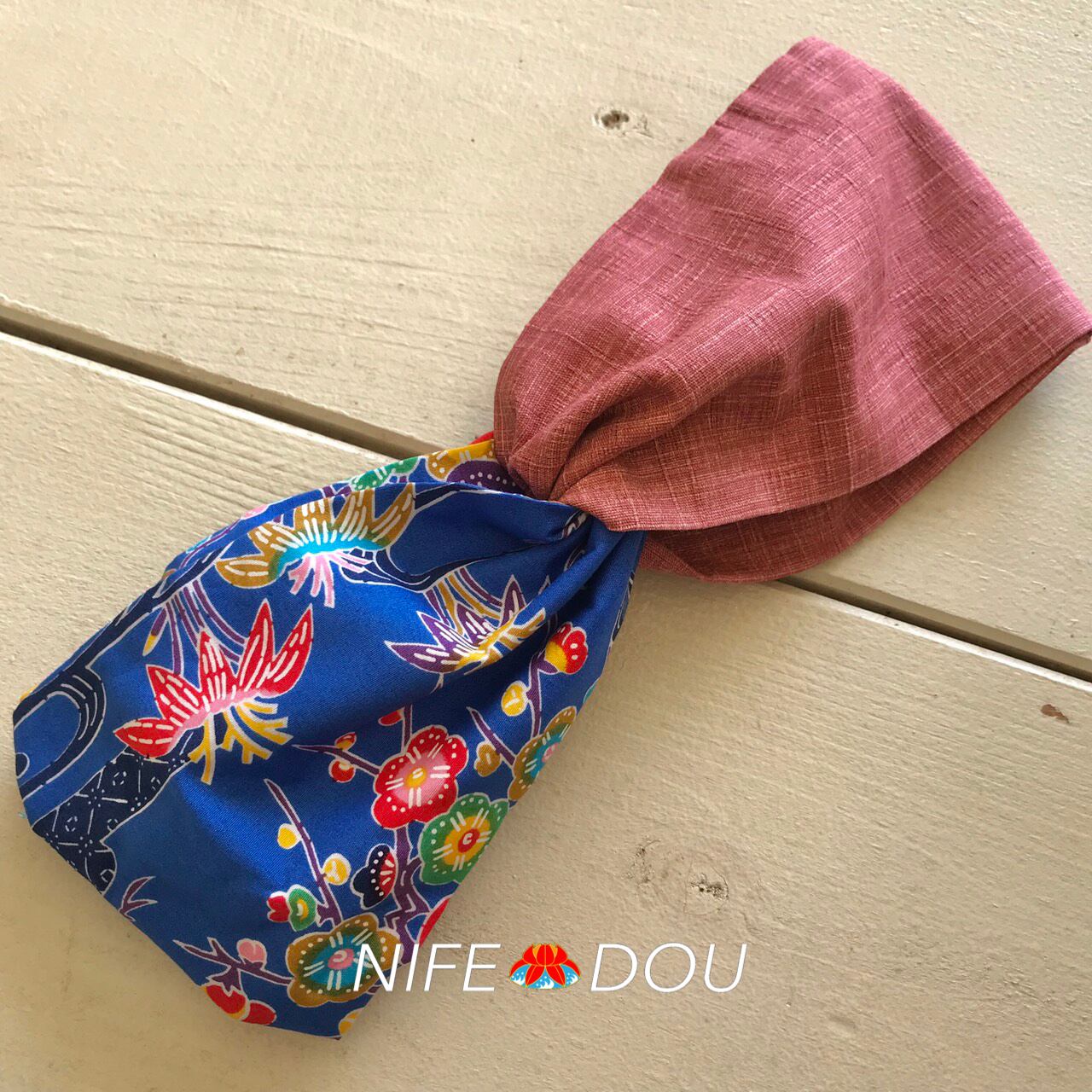 【クロスターバン】綿青紅型柄×ピンク/沖縄クロスターバン