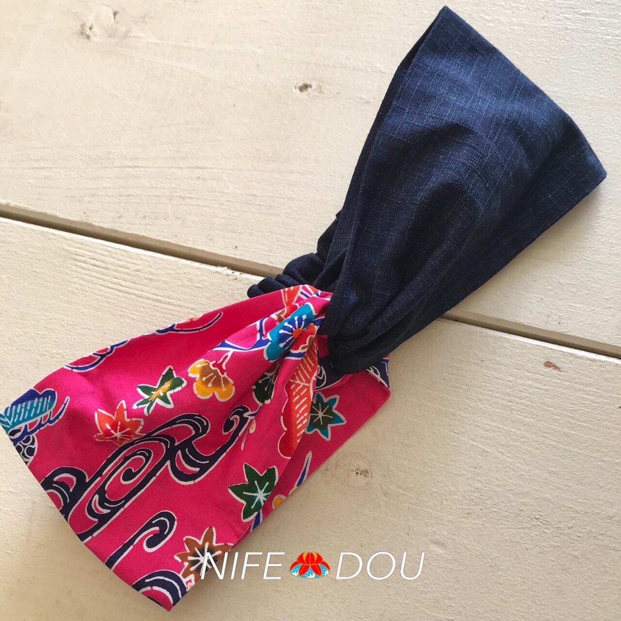 【クロスターバン】綿ピンク紅型柄×紺/沖縄クロスターバン