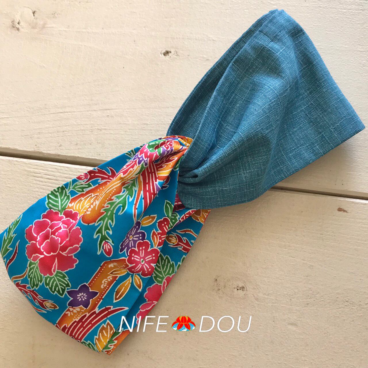 【クロスターバン】綿水色紅型柄×水色/沖縄クロスターバン