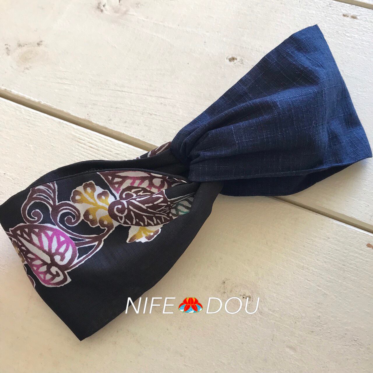 【紅型柄クロスターバン】黒紅型柄×紺クロスターバン/沖縄クロスターバン