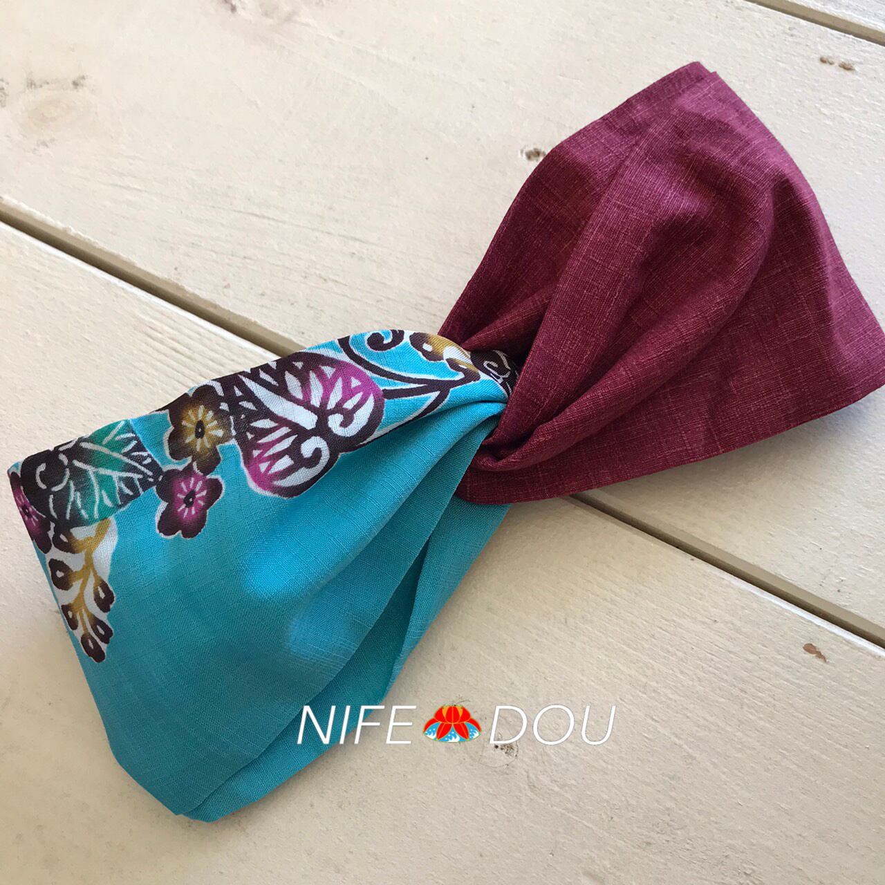 【紅型柄クロスターバン】青緑紅型柄×赤クロスターバン/沖縄クロスターバン