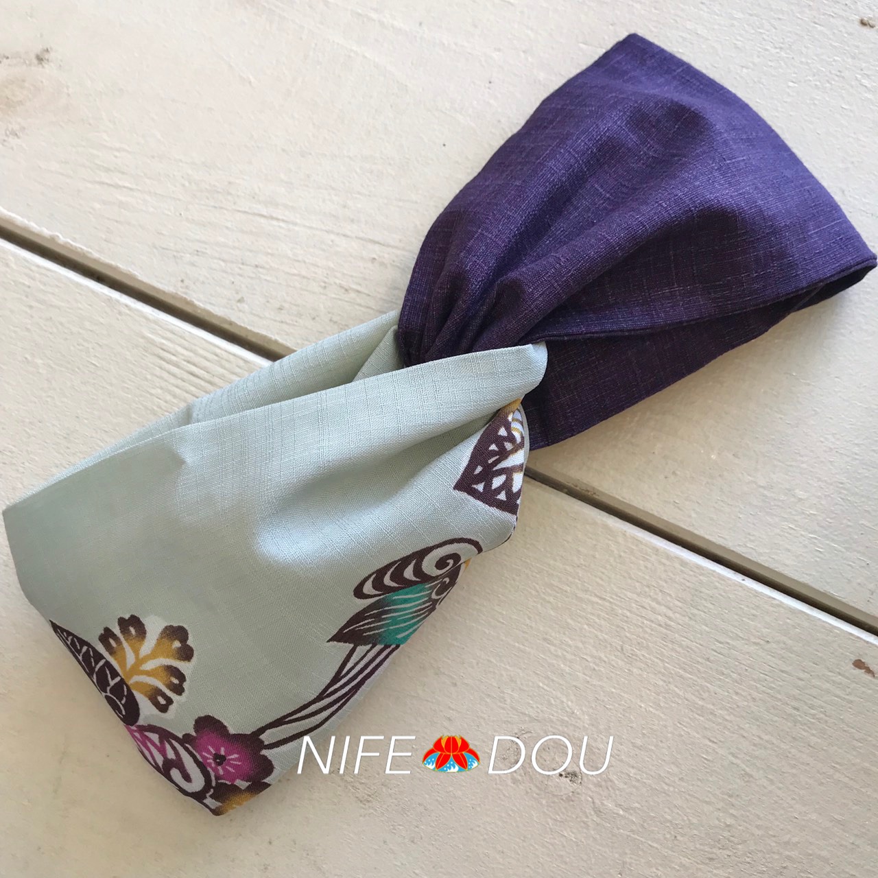 【紅型柄クロスターバン】薄緑紅型柄×紫クロスターバン/沖縄クロスターバン