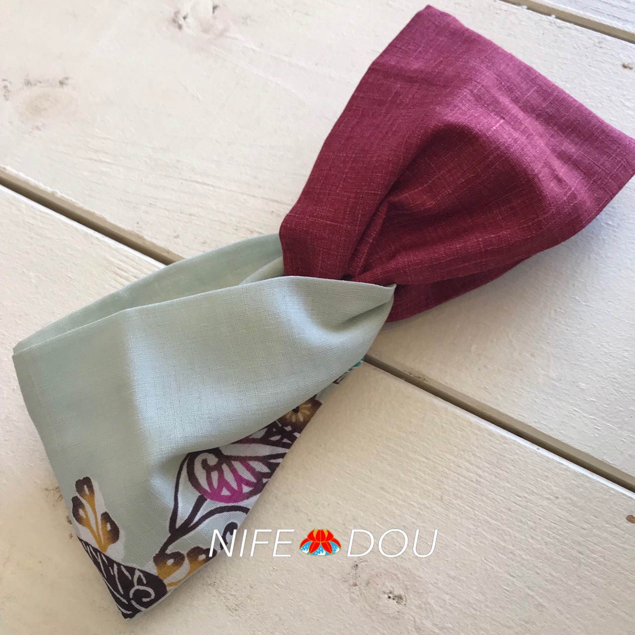 【紅型柄クロスターバン】薄緑紅型柄×赤クロスターバン/沖縄クロスターバン