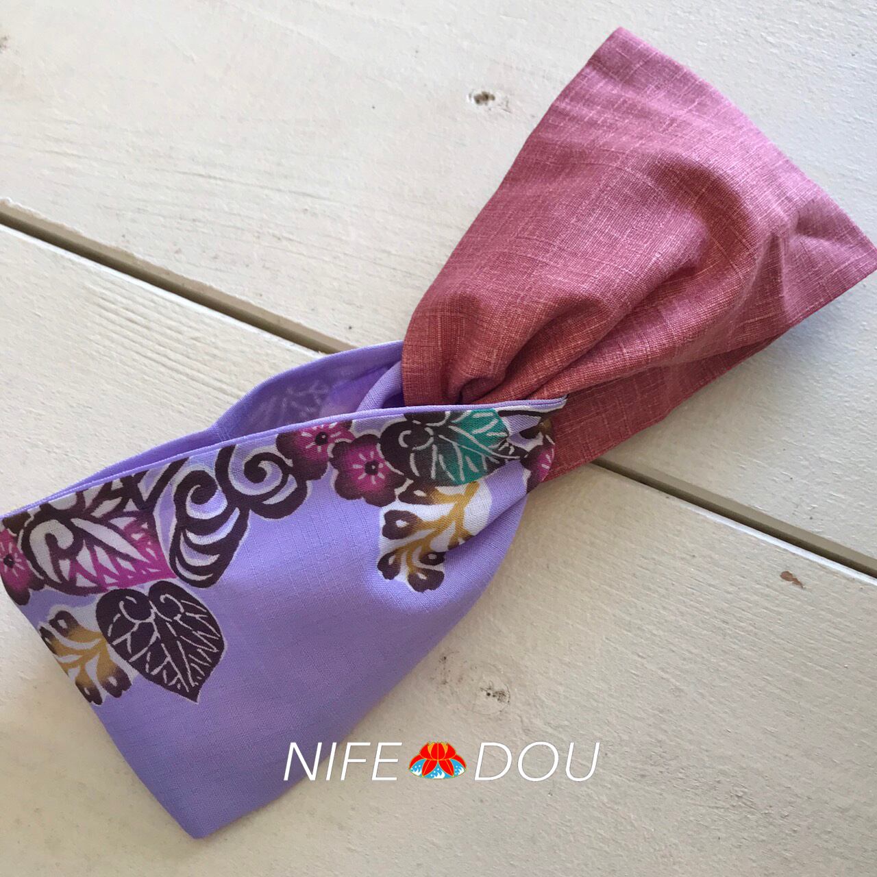 【紅型柄クロスターバン】紫紅型柄×ピンククロスターバン/沖縄クロスターバン