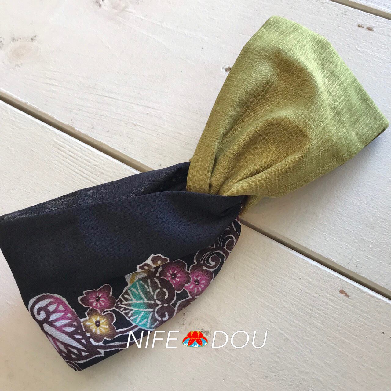 【紅型柄クロスターバン】黒紅型柄×黄緑クロスターバン/沖縄クロスターバン