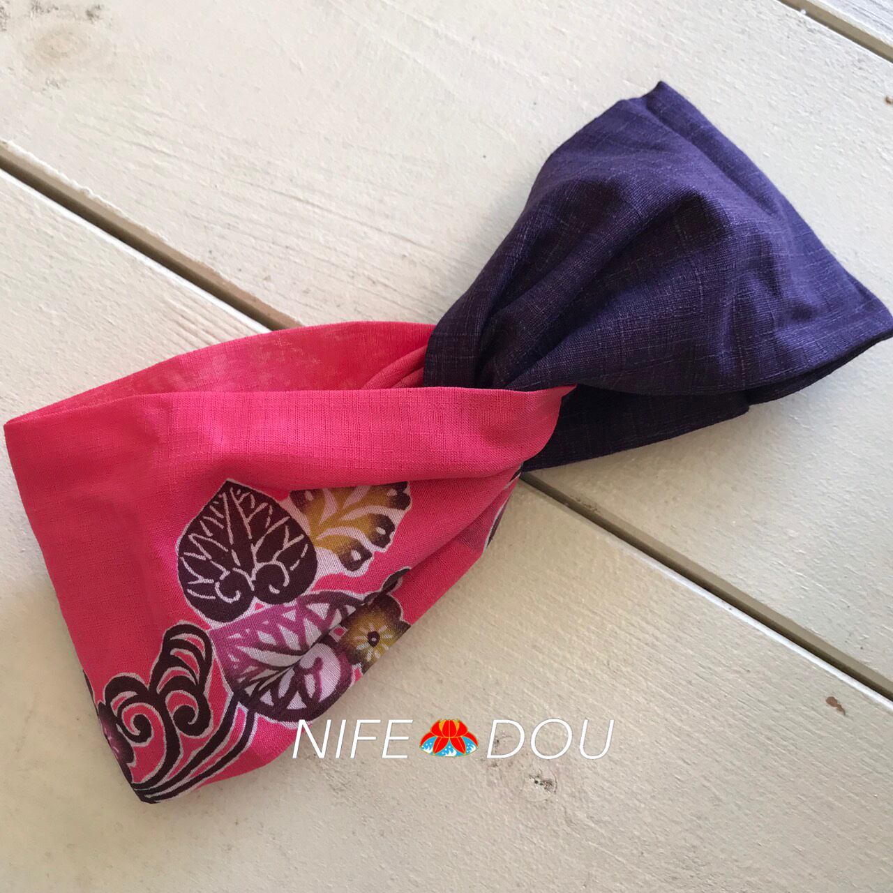 【紅型柄クロスターバン】濃ピンク紅型柄×紫クロスターバン/沖縄クロスターバン