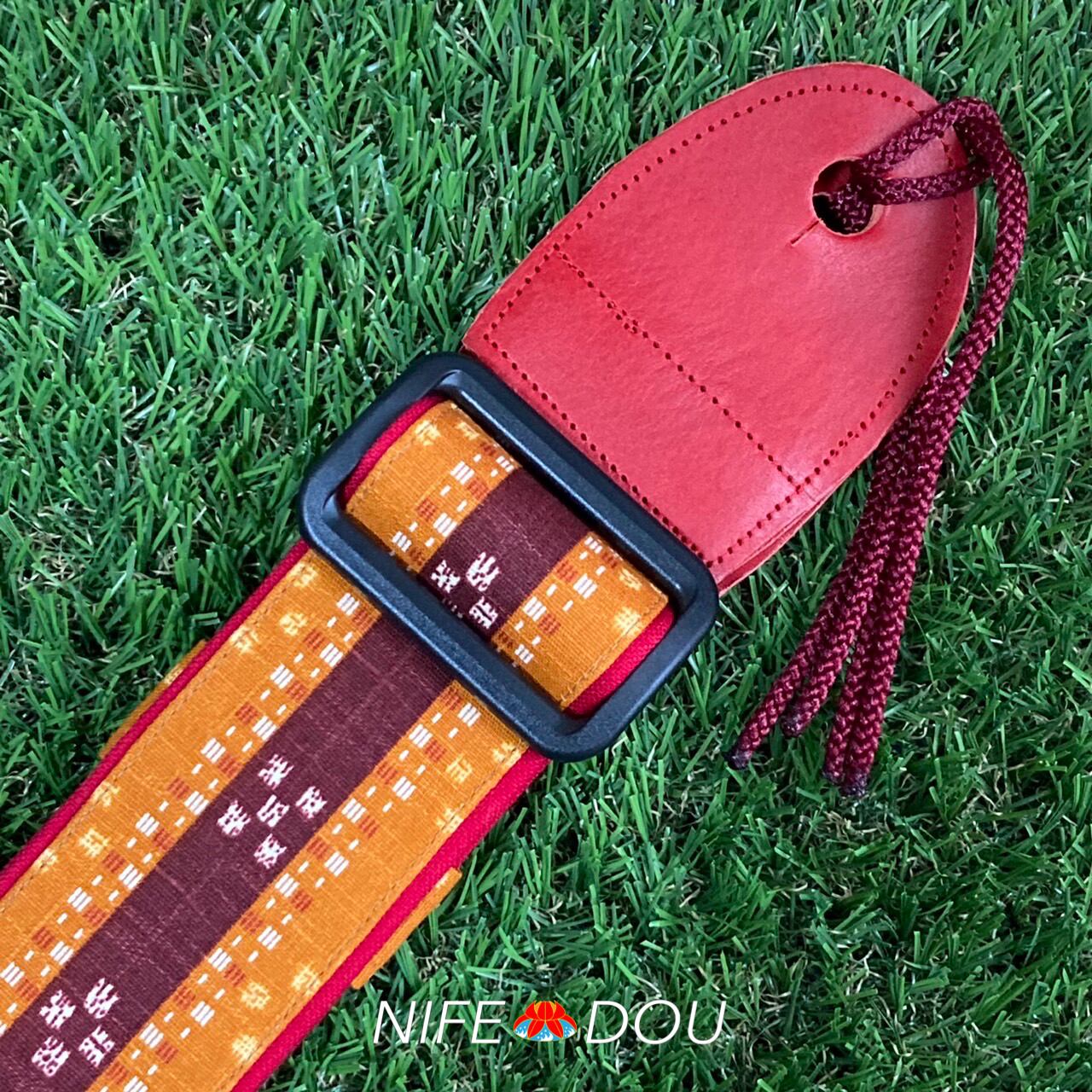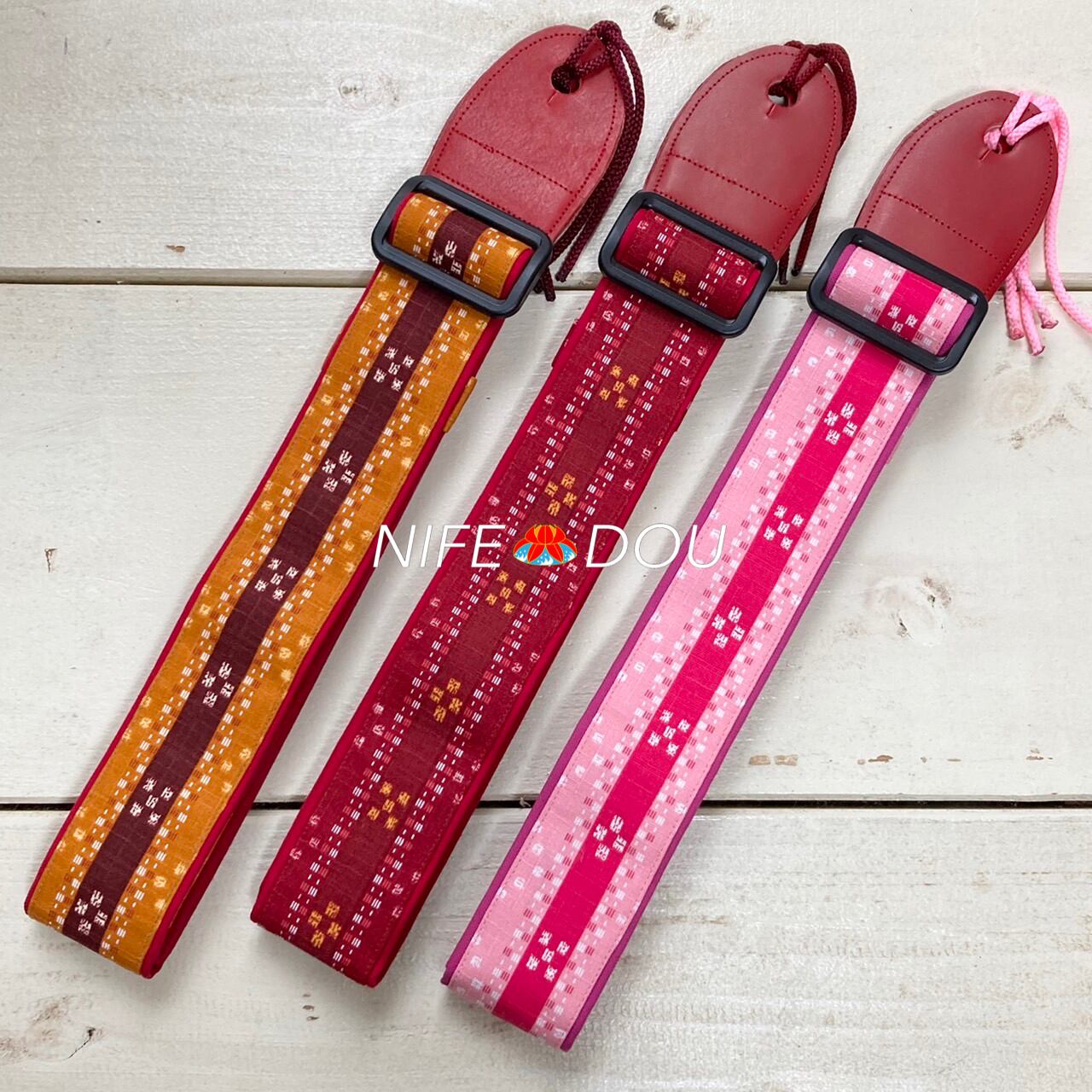 【三線ストラップ】【赤地×オレンジミンサー柄×赤】【三線ベルト】